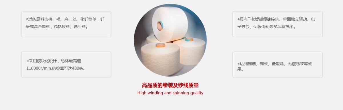 通過(guò)眾多新技術(shù)的應(yīng)用,具有接近全自動(dòng)轉(zhuǎn)杯紡紗機(jī)的紡紗質(zhì)量和卷裝質(zhì)量,性價(jià)比出眾。