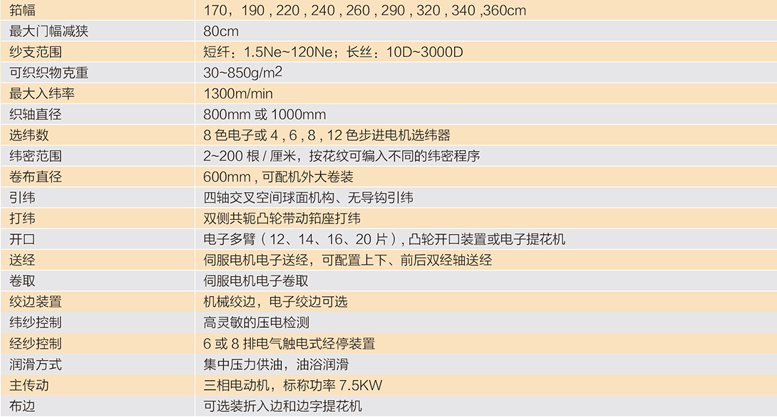 該機(jī)設(shè)計(jì)轉(zhuǎn)速700轉(zhuǎn)/分,最大入緯率1300米/分,筘幅范圍170~360厘米,不僅可織造各種服裝、裝飾面料,而且可織造輕型和中重型工業(yè)纖維和玻璃纖維。